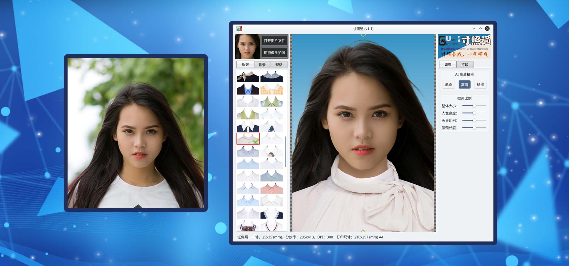 使用包含了正面人脸的普通照片制作标准证件照 为已有的证件照更换背景和服装 提供超过百套服装供选择 可自定义背景颜色,包括纯色、线性渐变、径向渐变三种颜色模式 提供多种标准证件照尺寸规格,并可自行添加新规格 灵活的打印布局,可选多种纸张规格和类型,并可导出图片文件